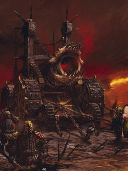 A Hellcannon is a massive smoking construct of metal that growls and shakes with daemonic sentience. In battle, these arcane engines heave crackling blasts of raw energy that soar through the air into their targets, liquifying anything they touch and sending the survivors insane with fear. Hellcannons are guided by a team of corrupt and sadistic Chaos Dwarfs. These malign warsmiths escort and restrain the Hellcannons in battle, for the Daemons bound within hunger for a banquet of flesh.[1a]